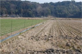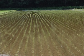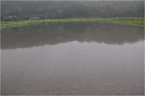 <深水ヒエ除草法1> 直播きした稲が芽を出すとすぐに深水にして稲を3〜4日間完全に水没させます。 |