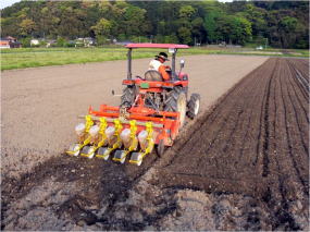 合鴨乾田直播 田植えをしないで直接種もみを播きます。 大幅な省力化です。 |