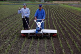 乾田直播の稲の条間をギリギリまで中耕除草する機械を農機メーカーオーレック社の開発部と共同で開発試験をしています。 |